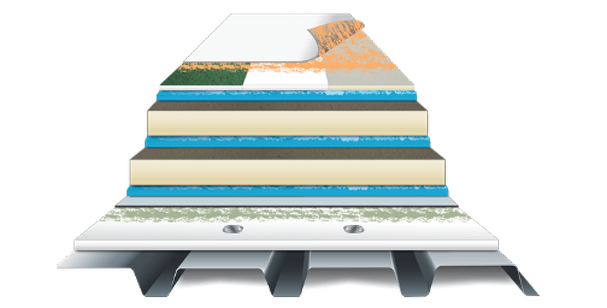 Sure-Flex PVC is installed over a steel deck using a fully adhered attachment method. This design delivers maximum redundancy with multiple protective layers, exceptional fire resistance, and long-lasting durability.
